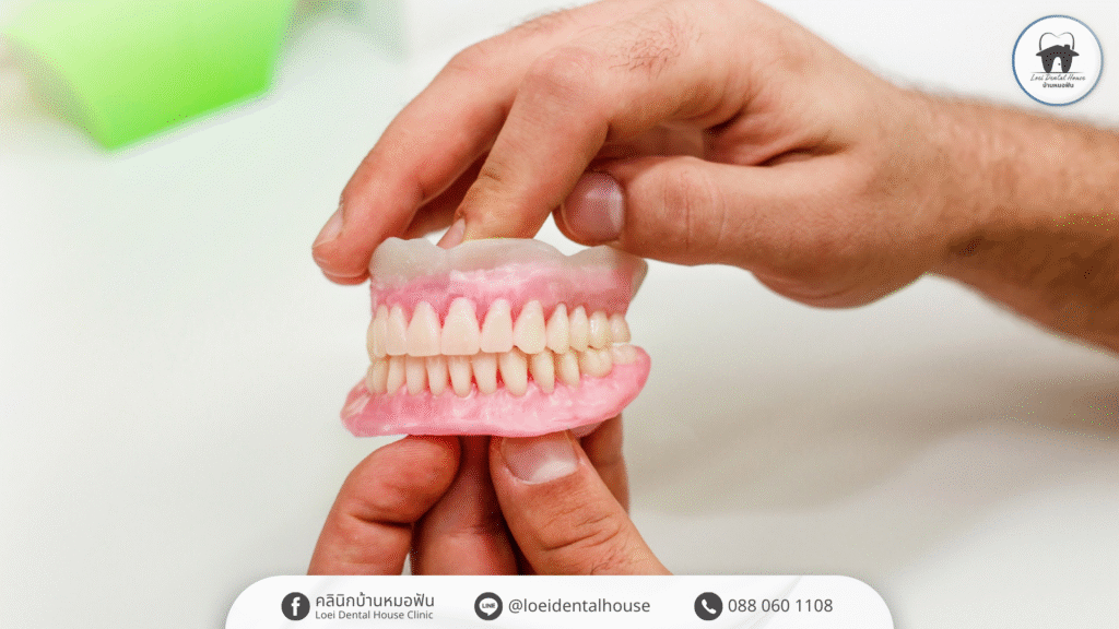 - ฟันปลอมชนิดถอดได้: ต้องถอดทำความสะอาดหลังมื้ออาหาร และห้ามใส่นอนเพื่อป้องกันการติดเชื้อรา (Candidiasis) ในช่องปาก และลดแรงกดทับต่อเหงือก